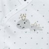 Kojenecké body ve střihu "kimono" pro miminko se zapínáním na patentek se rychle a snadno obléká. Má celoplošný vzor se třpytivými hvězdičkami a vpředu obrázek Dino-chlapečka. Body má praktický provedení s ohrnutými rukávy, aby zahřály malé ručičky a zachránily před možným poškrábáním obličeje. Vyrobeno z měkké 100% bavlny s certifikací OEKO-TEX.